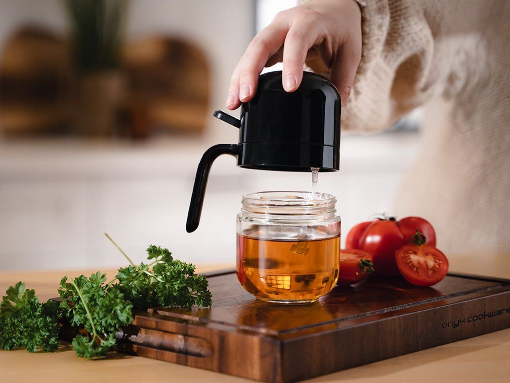 Dejte sbohem mastným skvrnám a nerovnoměrné aplikaci oleje. ONYX COOKWARE™ OLEJOVÝ SPREJ – 300 ML je ideálním společníkem pro každého, kdo chce zdravější a přesnější způsob vaření. Ať už grilujete, pečete, restujete nebo smažíte horkým vzduchem, tento elegantní, kompaktní sprej zajistí, že vždy použijete přesně tolik oleje, kolik potřebujete – ani více, ani méně.