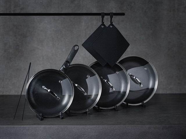Co opravdu odlišuje naše produkty od běžných hrnců a pánví, je unikátní proces laserového rytí, který vytváří patentovaný hexagonální design ONYX COOKWARE™. Tento jedinečný proces vytváří sérii vrcholků a údolí na hrncích a pánvích. V údolí je nepřilnavý materiál, který zajišťuje, že získáte tu nepřilnavou funkčnost a snadné čištění. Na vrcholcích je nerezová ocel, která poskytuje odolnost, dokonalé opečení masa a možnost použití kovových nástrojů a nářadí. Proto nazýváme naše hrnce a pánve „hybridní“. Poskytují vám to nejlepší z obou světů; Nepřilnavou funkčnost, kterou všichni chceme ve svých hrncích a pánvích, a odolnost profesionální nerezové oceli nebo litinové pánve.