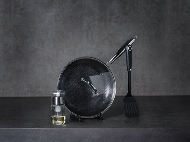 Co opravdu odlišuje naše produkty od běžných hrnců a pánví, je unikátní proces laserového rytí, který vytváří patentovaný hexagonální design ONYX COOKWARE™. Tento jedinečný proces vytváří sérii vrcholků a údolí na hrncích a pánvích. V údolí je nepřilnavý materiál, který zajišťuje, že získáte tu nepřilnavou funkčnost a snadné čištění. Na vrcholcích je nerezová ocel, která poskytuje odolnost, dokonalé opečení masa a možnost použití kovových nástrojů a nářadí. Proto nazýváme naše hrnce a pánve „hybridní“. Poskytují vám to nejlepší z obou světů; Nepřilnavou funkčnost, kterou všichni chceme ve svých hrncích a pánvích, a odolnost profesionální nerezové oceli nebo litinové pánve.