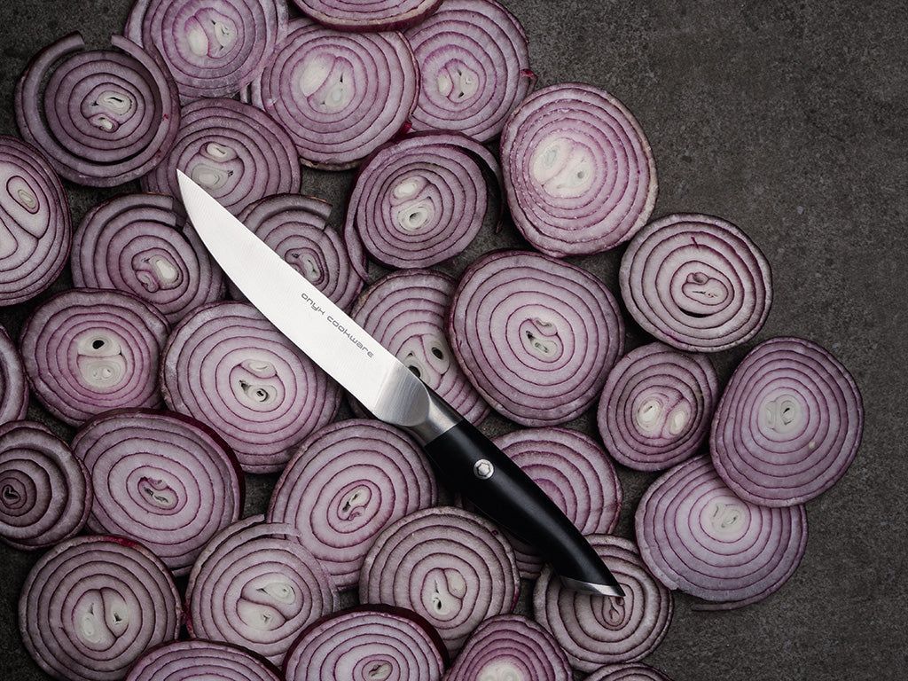 Nože ONYX COOKWARE™ mají rukojeť z kvalitního ABS materiálu, který nejenže poskytuje dokonalou rovnováhu a rozložení hmotnosti, ale také voděodolný a skvrnám odolný povrch, díky čemuž je bezpečnější pro práci v kuchyni. A podle nás navíc skvěle vypadá!